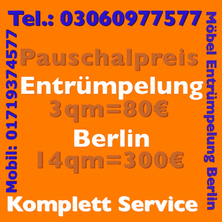 Ebenso wird eine BSR Abholung in privat 03060977577 schnell einmal notwendig. Mit uns als Partner lässt sie dies auch ohne langfristige Planung schnell komfortabel realisieren. Mit unseren Wohnungsauflösung Angeboten Entrümpelungsdienst Sperrmüllabholung privat, Möbel Abholung privat 03060977577 und auf Video Abholung und Bilder von Abholung Sperrmüll privat, erhalten Sie Ihre Emtrümpelung fachmännisch zum vereinbarten Preis. Wohnung Abholung in privat 03060977577 oder Möbel Abholung in privat 03060977577 werden jeweils im Rahmen unseres Abtransport-Sofortdienstes mit einem modernen Sprinter Fahrzeug durchgeführt und damit zu einem komfortablen Vorhaben zum exklusiven Hammerpreis. Bei uns stimmen Angebot, Preis, Leistung, Service. Überzeugen Sie sich und rufen Sie uns an. Unser professionelle Wohnungsentrümpelung privat Service ist jederzeit erreichbar und steht zu Ihrem Wunschtermin für alle Arbeiten rund um Abholung inkl. Abholung in privat 03060977577 zur Verfügung.